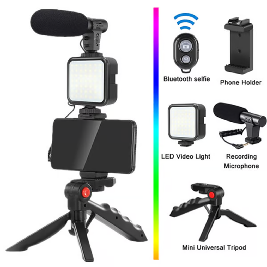 • COMPLETE PHONE VLOGGING KIT - with Shotgun Microphone, lighting adapter, ultra bright LED light, and adjustable tripod for recording videos, podcasts and vlogs.